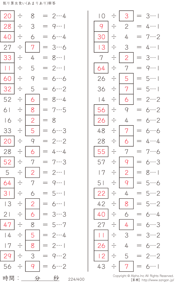 上記のボタンから「虫食い・割り算・あまりあり」の算数数学ドリル・計算ドリル(PDFプリント)がダウンロードできます。個人利用は無料です(家庭以外での配布は有料です)。