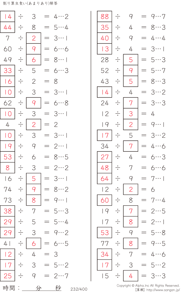上記のボタンから「虫食い・割り算・あまりあり」の算数数学ドリル・計算ドリル(PDFプリント)がダウンロードできます。個人利用は無料です(家庭以外での配布は有料です)。