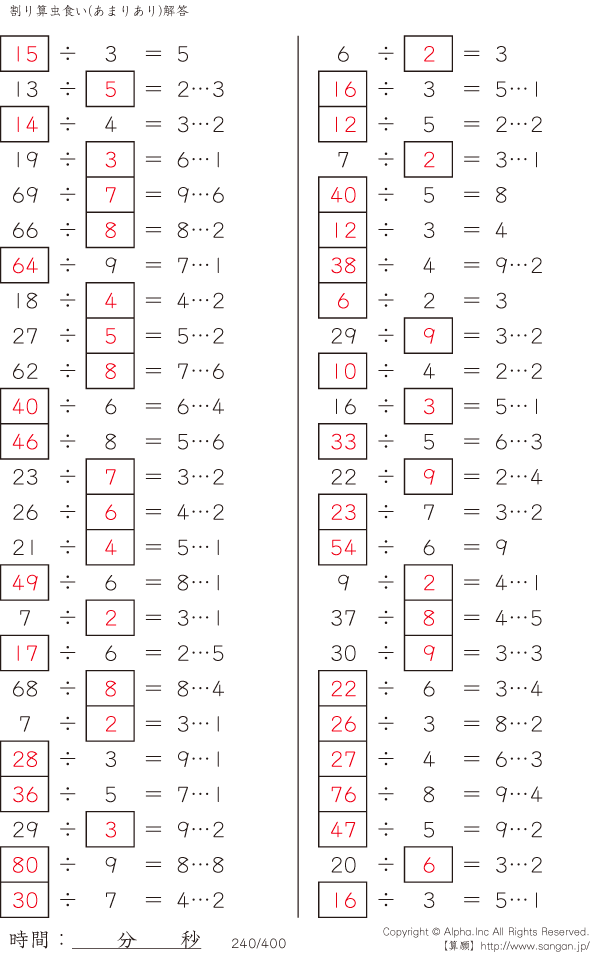 上記のボタンから「虫食い・割り算・あまりあり」の算数数学ドリル・計算ドリル(PDFプリント)がダウンロードできます。個人利用は無料です(家庭以外での配布は有料です)。