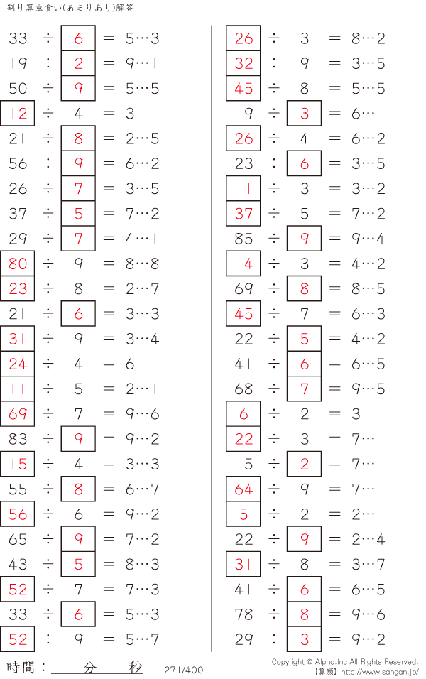 上記のボタンから「虫食い・割り算・あまりあり」の算数数学ドリル・計算ドリル(PDFプリント)がダウンロードできます。個人利用は無料です(家庭以外での配布は有料です)。