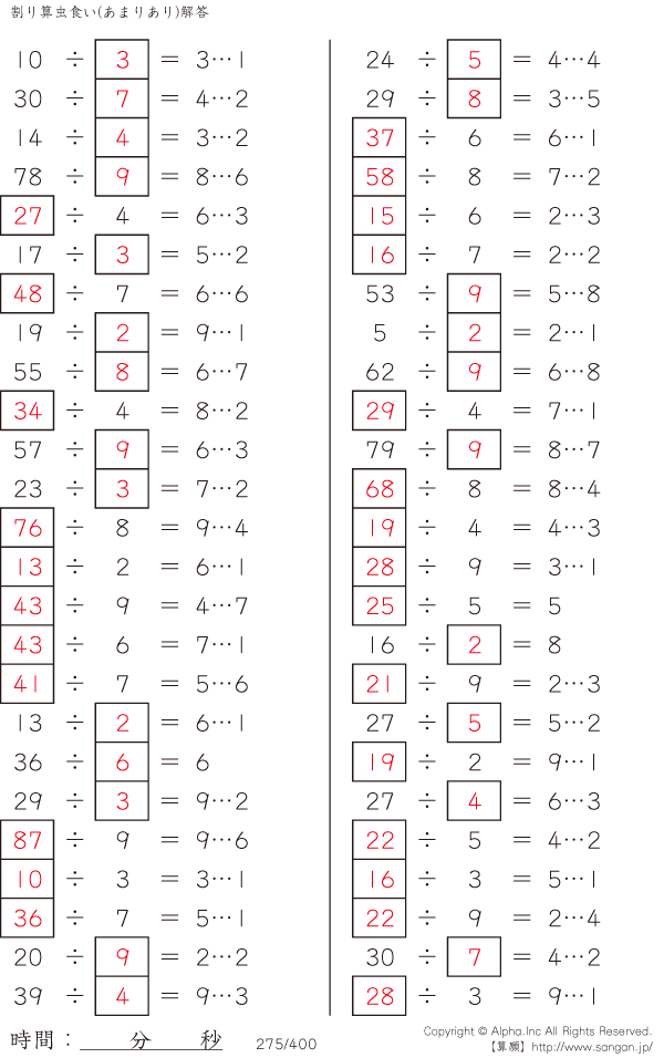 上記のボタンから「虫食い・割り算・あまりあり」の算数数学ドリル・計算ドリル(PDFプリント)がダウンロードできます。個人利用は無料です(家庭以外での配布は有料です)。