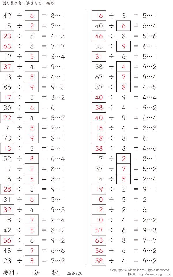 上記のボタンから「虫食い・割り算・あまりあり」の算数数学ドリル・計算ドリル(PDFプリント)がダウンロードできます。個人利用は無料です(家庭以外での配布は有料です)。