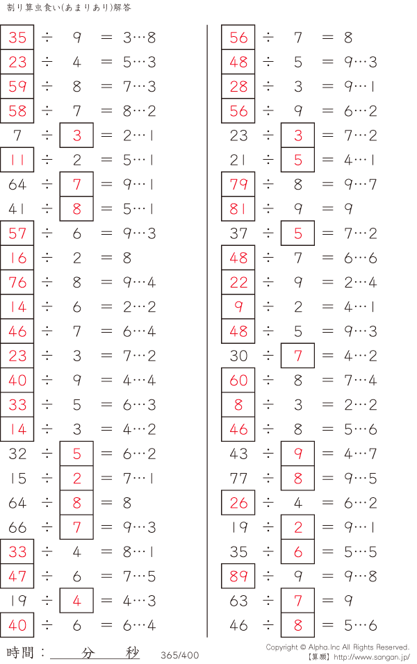上記のボタンから「虫食い・割り算・あまりあり」の算数数学ドリル・計算ドリル(PDFプリント)がダウンロードできます。個人利用は無料です(家庭以外での配布は有料です)。
