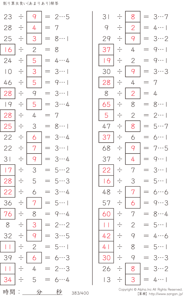 上記のボタンから「虫食い・割り算・あまりあり」の算数数学ドリル・計算ドリル(PDFプリント)がダウンロードできます。個人利用は無料です(家庭以外での配布は有料です)。