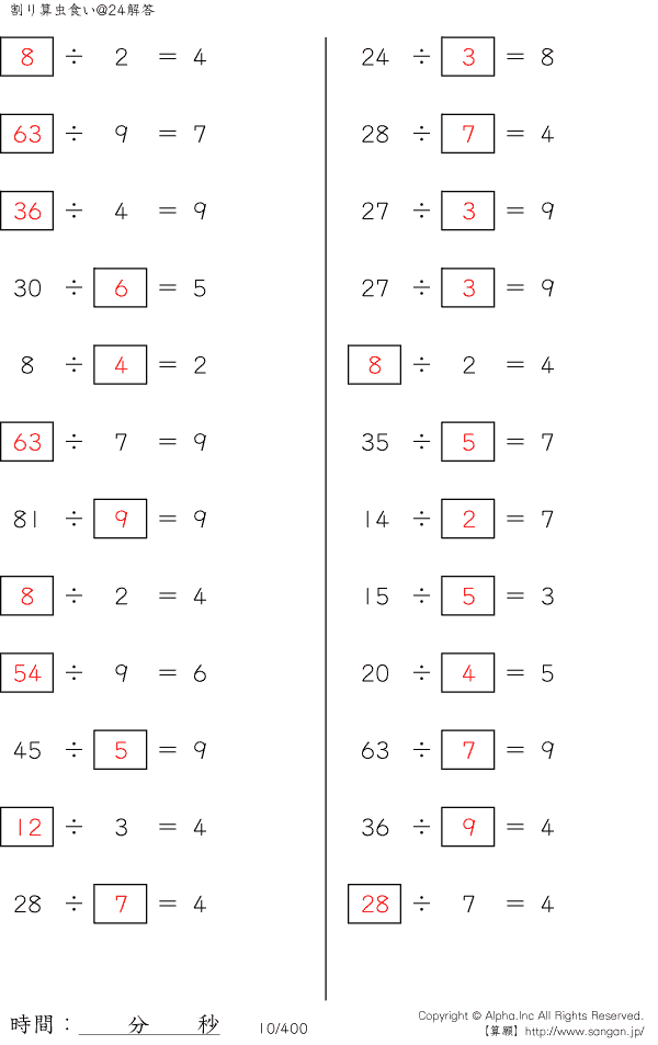 上記のボタンから「虫食い・割り算・あまりなし@24」の算数数学ドリル・計算ドリル(PDFプリント)がダウンロードできます。個人利用は無料です(家庭以外での配布は有料です)。
