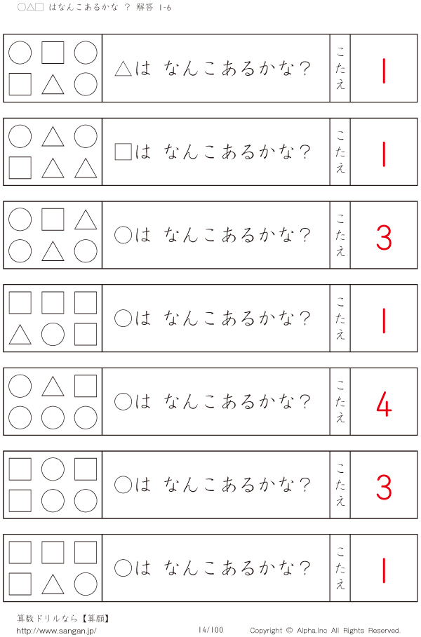 ○△□はなんこかな?1-6-[プリント一覧] [解答]014/100