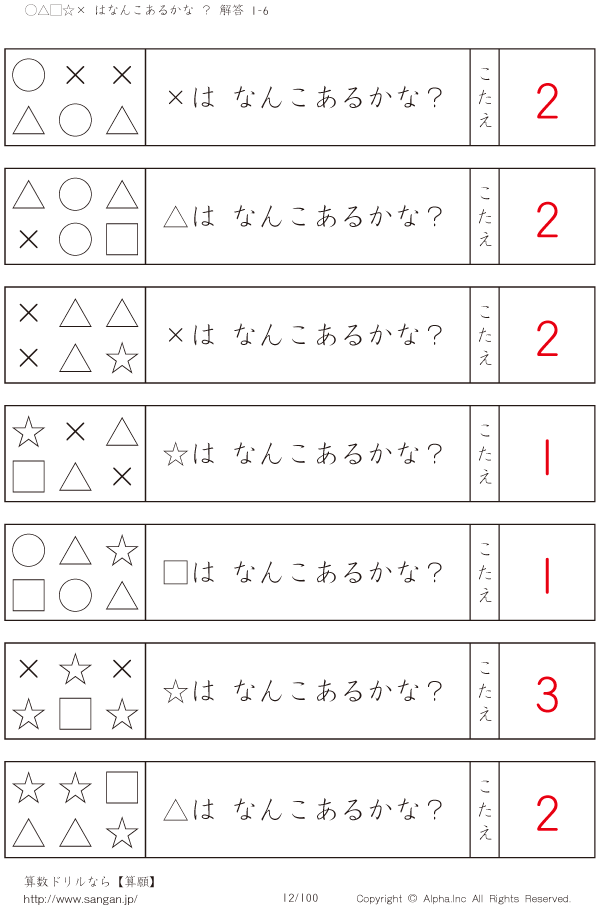 ○△□×☆はなんこかな?1-6-[プリント一覧] [解答]012/100
