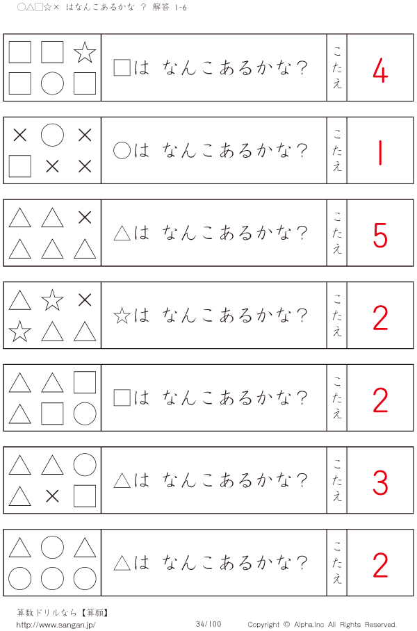 ○△□×☆はなんこかな?1-6-[プリント一覧] [解答]034/100