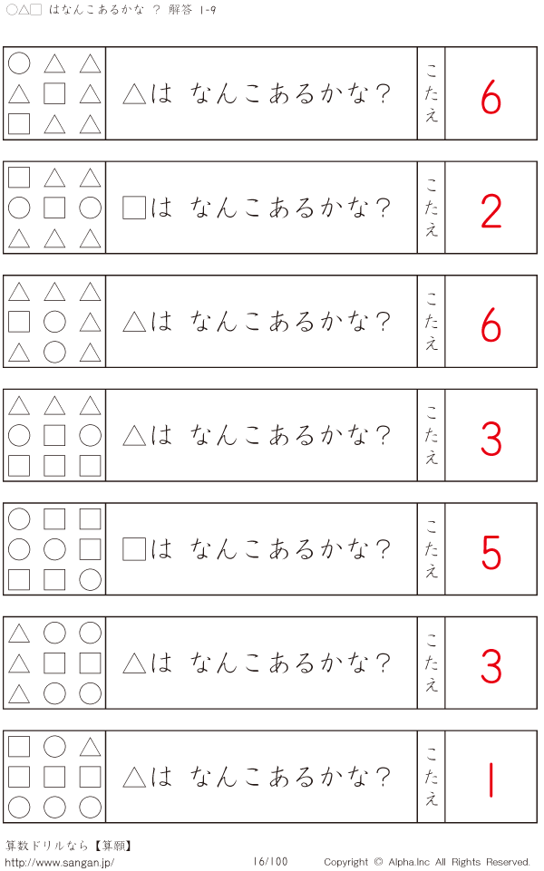 ○△□はなんこかな?1-9-[プリント一覧] [解答]016/100
