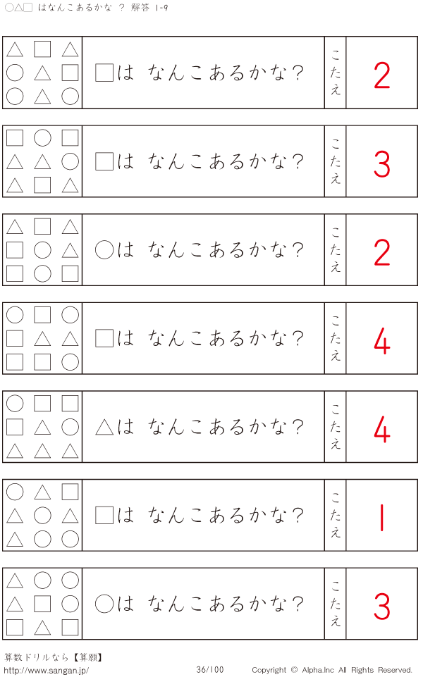 ○△□はなんこかな?1-9-[プリント一覧] [解答]036/100
