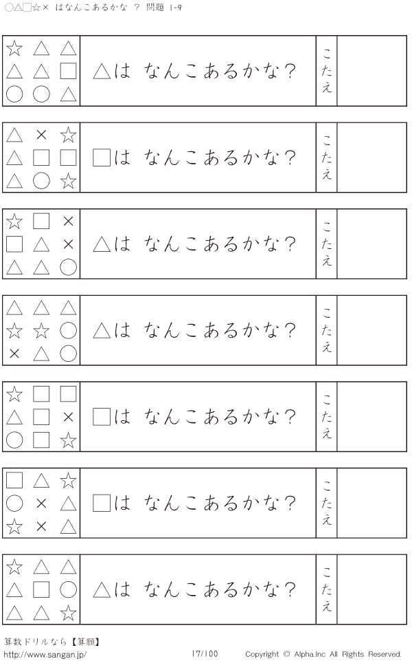 ○△□×☆はなんこかな?1-9-[プリント一覧] [問題]017/100