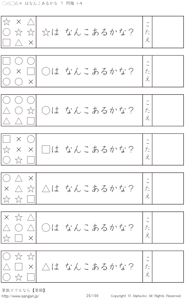 ○△□×☆はなんこかな?1-9-[プリント一覧] [問題]025/100