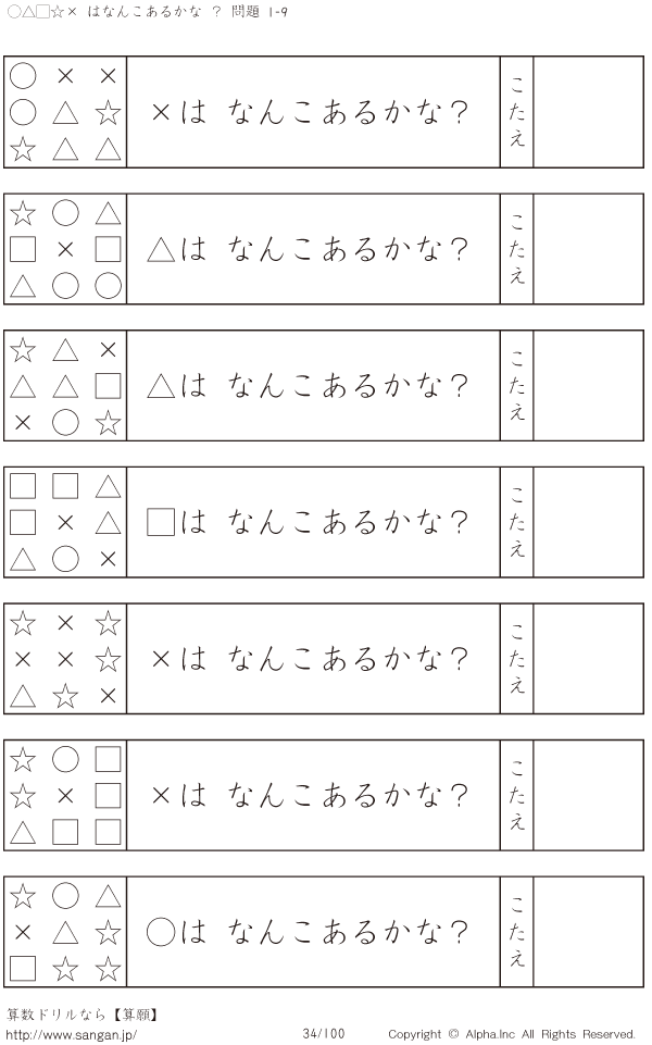 ○△□×☆はなんこかな?1-9-[プリント一覧] [問題]034/100