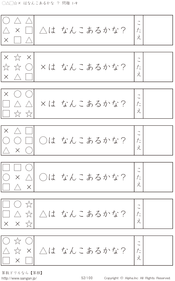 ○△□×☆はなんこかな?1-9-[プリント一覧] [問題]052/100