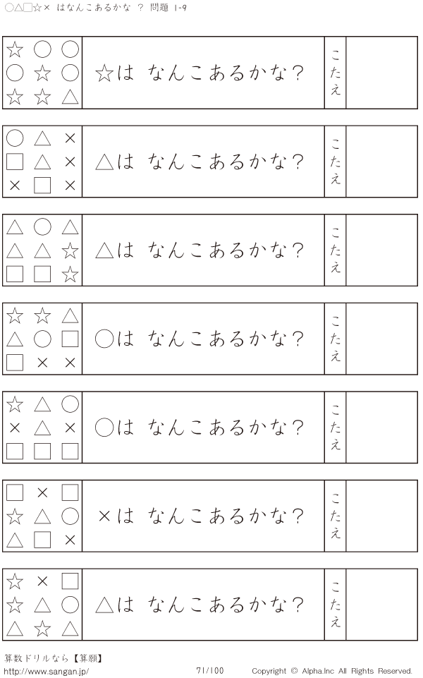 上記のボタンから「○△□×☆はなんこかな?1-9-[プリント一覧]」の算数数学ドリル・計算ドリル(PDFプリント)がダウンロードできます。個人利用は無料です(家庭以外での配布は有料です)。