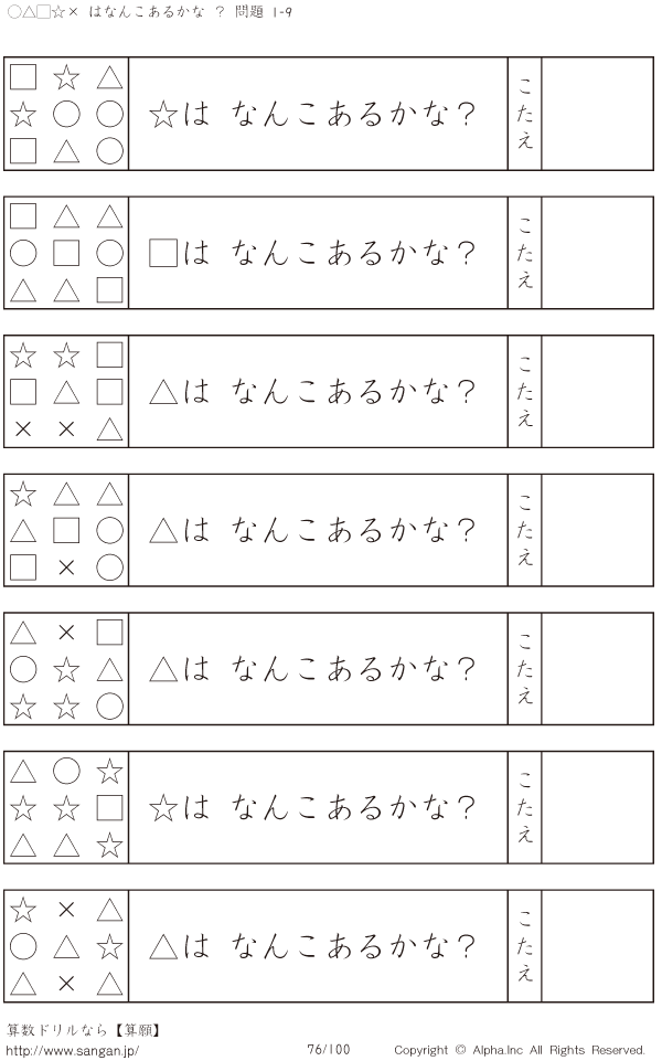 ○△□×☆はなんこかな?1-9-[プリント一覧] [問題]076/100