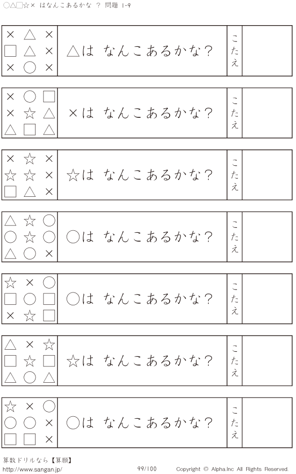 ○△□×☆はなんこかな?1-9-[プリント一覧] [問題]099/100