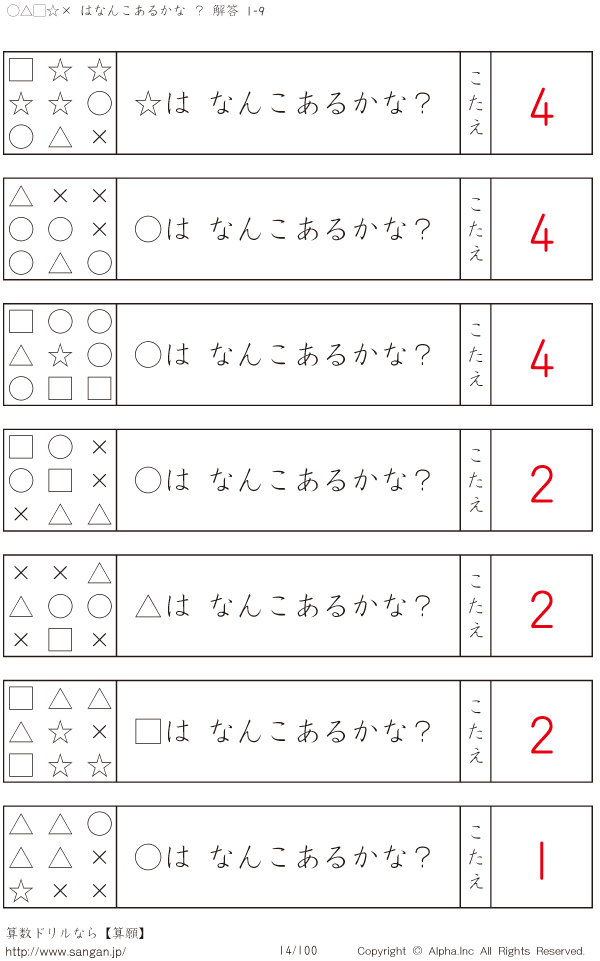 ○△□×☆はなんこかな?1-9-[プリント一覧] [解答]014/100