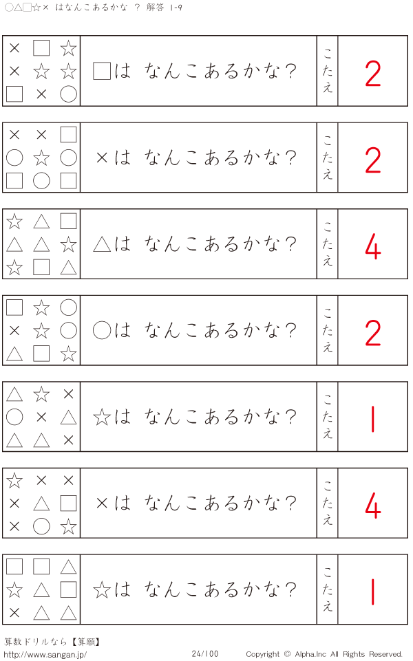 ○△□×☆はなんこかな?1-9-[プリント一覧] [解答]024/100