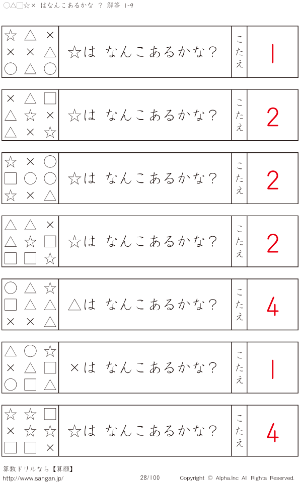 ○△□×☆はなんこかな?1-9-[プリント一覧] [解答]028/100