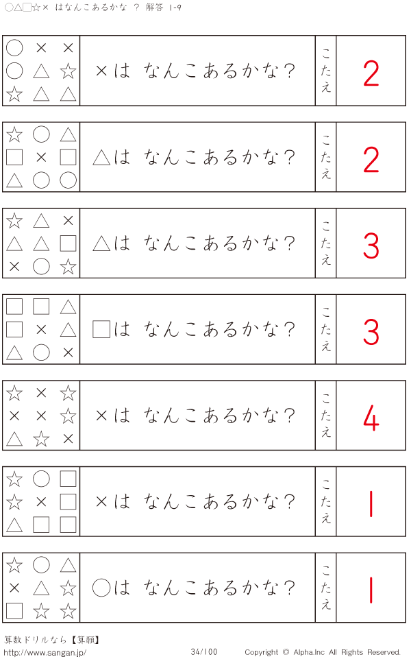 ○△□×☆はなんこかな?1-9-[プリント一覧] [解答]034/100