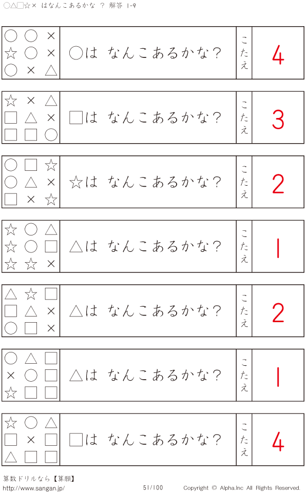 ○△□×☆はなんこかな?1-9-[プリント一覧] [解答]051/100