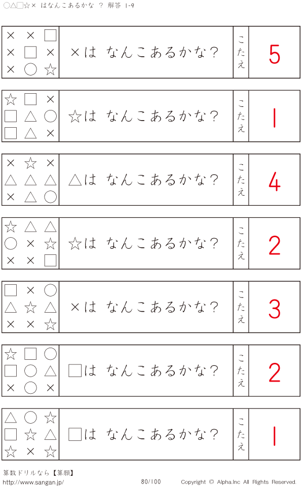 ○△□×☆はなんこかな?1-9-[プリント一覧] [解答]080/100