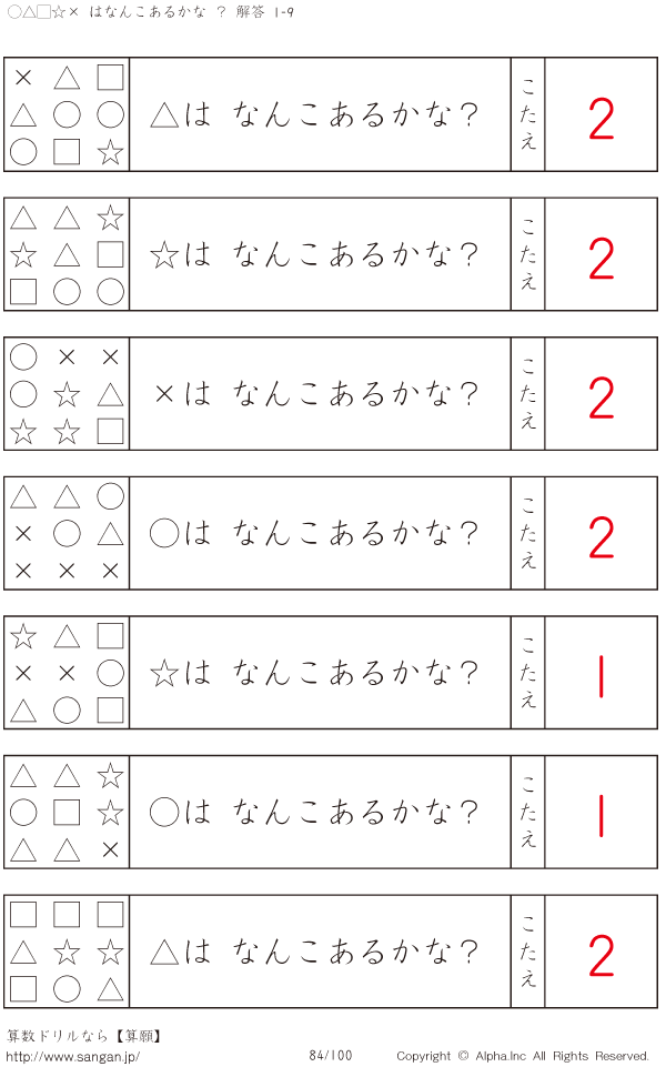 ○△□×☆はなんこかな?1-9-[プリント一覧] [解答]084/100