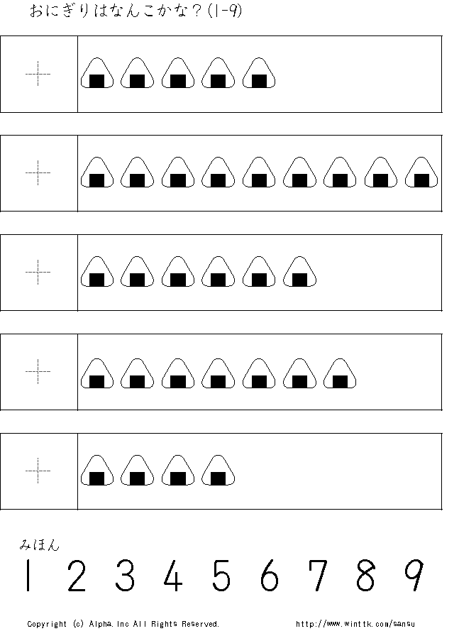 上記のボタンから「なんこかな?1-9」の算数数学ドリル・計算ドリル(PDFプリント)がダウンロードできます。個人利用は無料です(家庭以外での配布は有料です)。