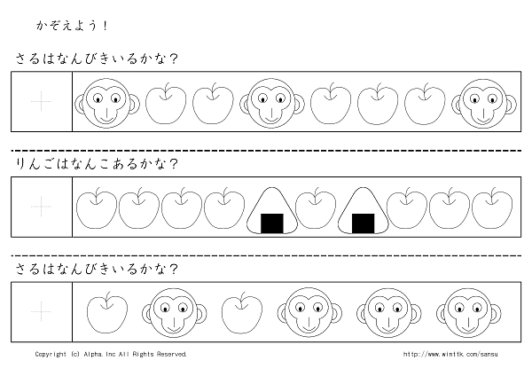 上記のボタンから「かぞえよう1(イラストは2種類)」の算数数学ドリル・計算ドリル(PDFプリント)がダウンロードできます。個人利用は無料です(家庭以外での配布は有料です)。