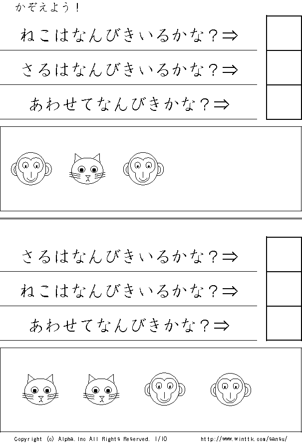 上記のボタンから「あわせてなんびきかな?」の算数数学ドリル・計算ドリル(PDFプリント)がダウンロードできます。個人利用は無料です(家庭以外での配布は有料です)。