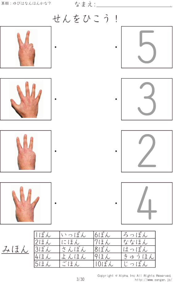 上記のボタンから「ゆびはなんほんかな?(片手-線を引く)」の算数数学ドリル・計算ドリル(PDFプリント)がダウンロードできます。個人利用は無料です(家庭以外での配布は有料です)。