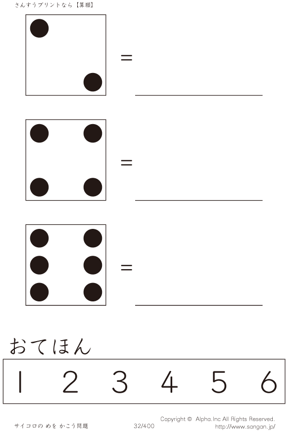 上記のボタンから「サイコロのめをかぞえよう」の算数数学ドリル・計算ドリル(PDFプリント)がダウンロードできます。個人利用は無料です(家庭以外での配布は有料です)。