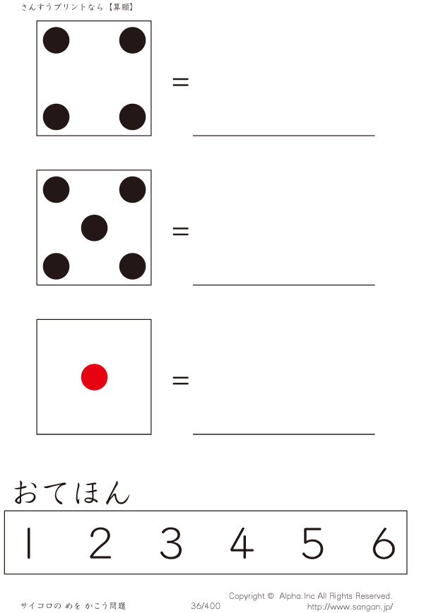 上記のボタンから「サイコロのめをかぞえよう」の算数数学ドリル・計算ドリル(PDFプリント)がダウンロードできます。個人利用は無料です(家庭以外での配布は有料です)。