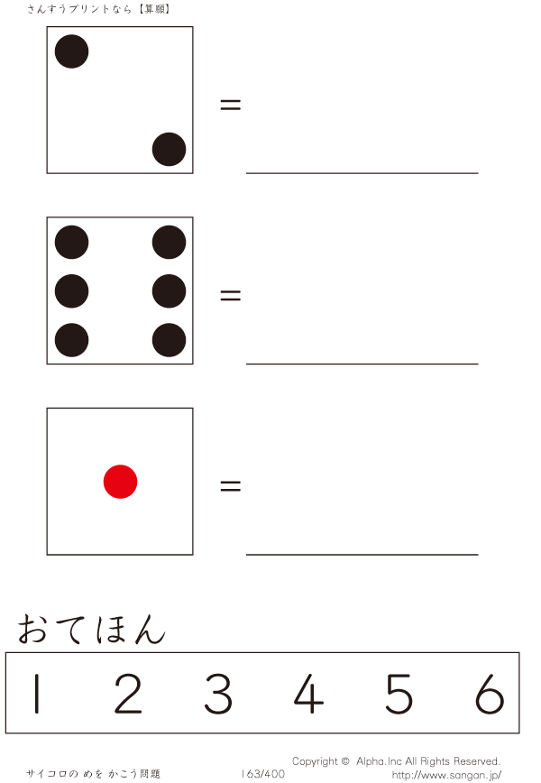 上記のボタンから「サイコロのめをかぞえよう」の算数数学ドリル・計算ドリル(PDFプリント)がダウンロードできます。個人利用は無料です(家庭以外での配布は有料です)。