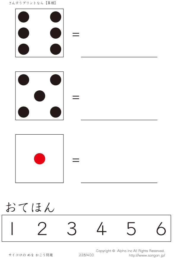 上記のボタンから「サイコロのめをかぞえよう」の算数数学ドリル・計算ドリル(PDFプリント)がダウンロードできます。個人利用は無料です(家庭以外での配布は有料です)。