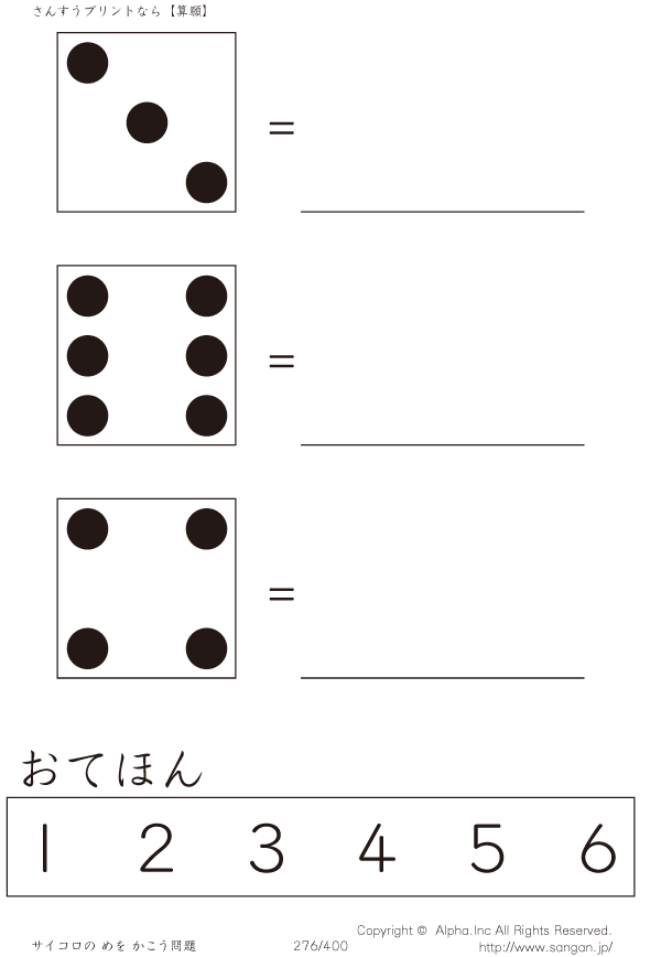 上記のボタンから「サイコロのめをかぞえよう」の算数数学ドリル・計算ドリル(PDFプリント)がダウンロードできます。個人利用は無料です(家庭以外での配布は有料です)。