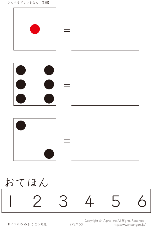 上記のボタンから「サイコロのめをかぞえよう」の算数数学ドリル・計算ドリル(PDFプリント)がダウンロードできます。個人利用は無料です(家庭以外での配布は有料です)。