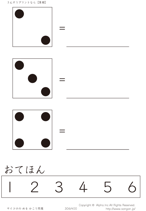 上記のボタンから「サイコロのめをかぞえよう」の算数数学ドリル・計算ドリル(PDFプリント)がダウンロードできます。個人利用は無料です(家庭以外での配布は有料です)。