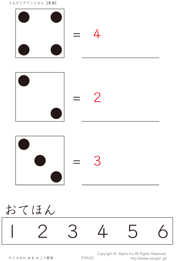 上記のボタンから「サイコロのめをかぞえよう」の算数数学ドリル・計算ドリル(PDFプリント)がダウンロードできます。個人利用は無料です(家庭以外での配布は有料です)。