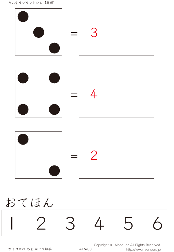 上記のボタンから「サイコロのめをかぞえよう」の算数数学ドリル・計算ドリル(PDFプリント)がダウンロードできます。個人利用は無料です(家庭以外での配布は有料です)。