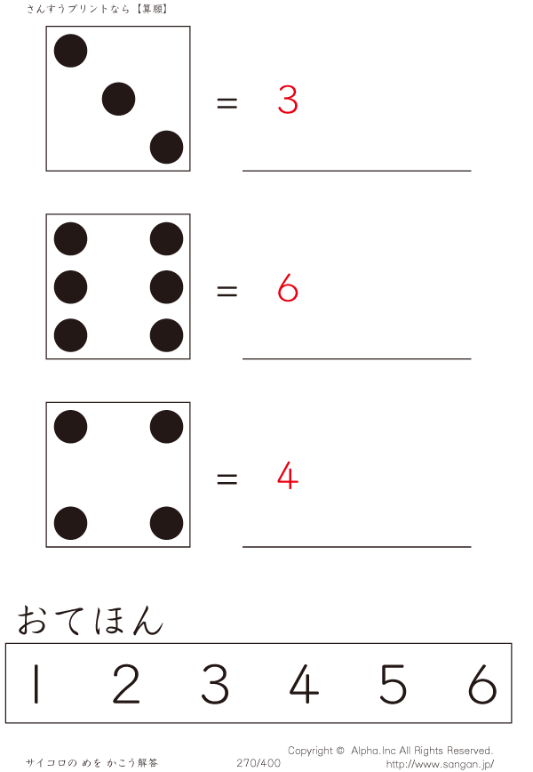 上記のボタンから「サイコロのめをかぞえよう」の算数数学ドリル・計算ドリル(PDFプリント)がダウンロードできます。個人利用は無料です(家庭以外での配布は有料です)。