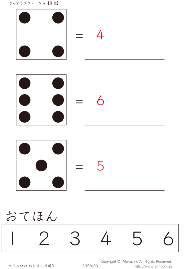 上記のボタンから「サイコロのめをかぞえよう」の算数数学ドリル・計算ドリル(PDFプリント)がダウンロードできます。個人利用は無料です(家庭以外での配布は有料です)。
