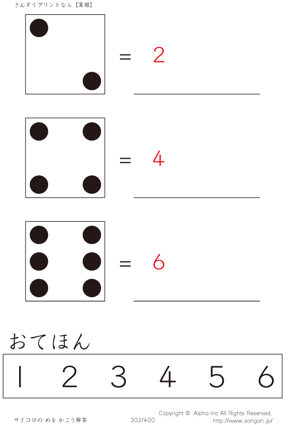 上記のボタンから「サイコロのめをかぞえよう」の算数数学ドリル・計算ドリル(PDFプリント)がダウンロードできます。個人利用は無料です(家庭以外での配布は有料です)。