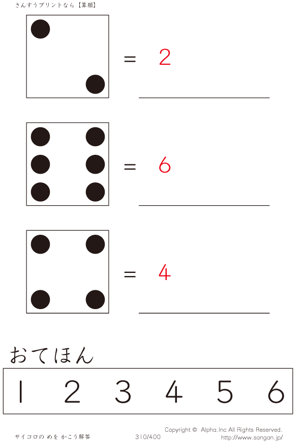 上記のボタンから「サイコロのめをかぞえよう」の算数数学ドリル・計算ドリル(PDFプリント)がダウンロードできます。個人利用は無料です(家庭以外での配布は有料です)。
