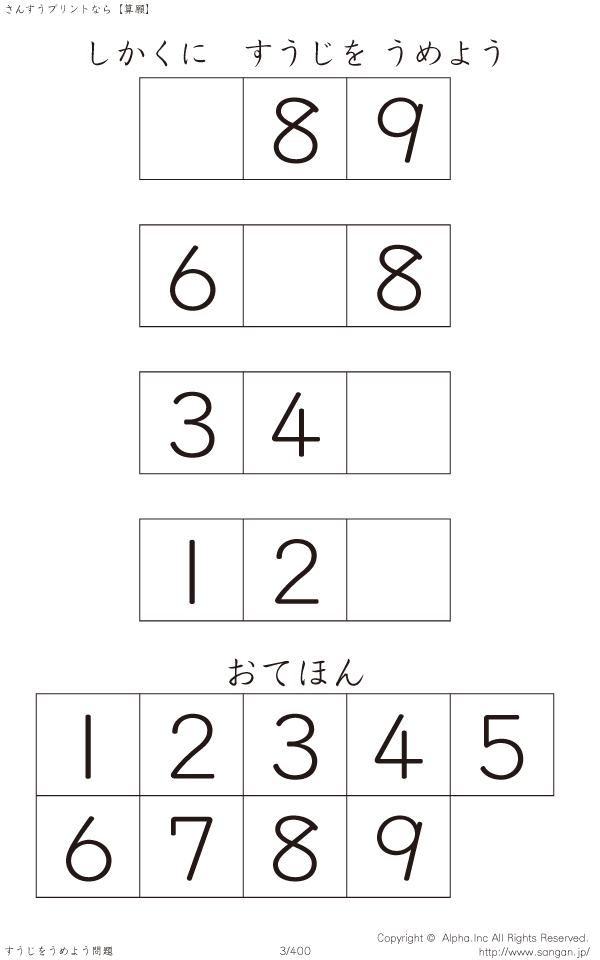 上記のボタンから「しかくにすうじをうめよう」の算数数学ドリル・計算ドリル(PDFプリント)がダウンロードできます。個人利用は無料です(家庭以外での配布は有料です)。