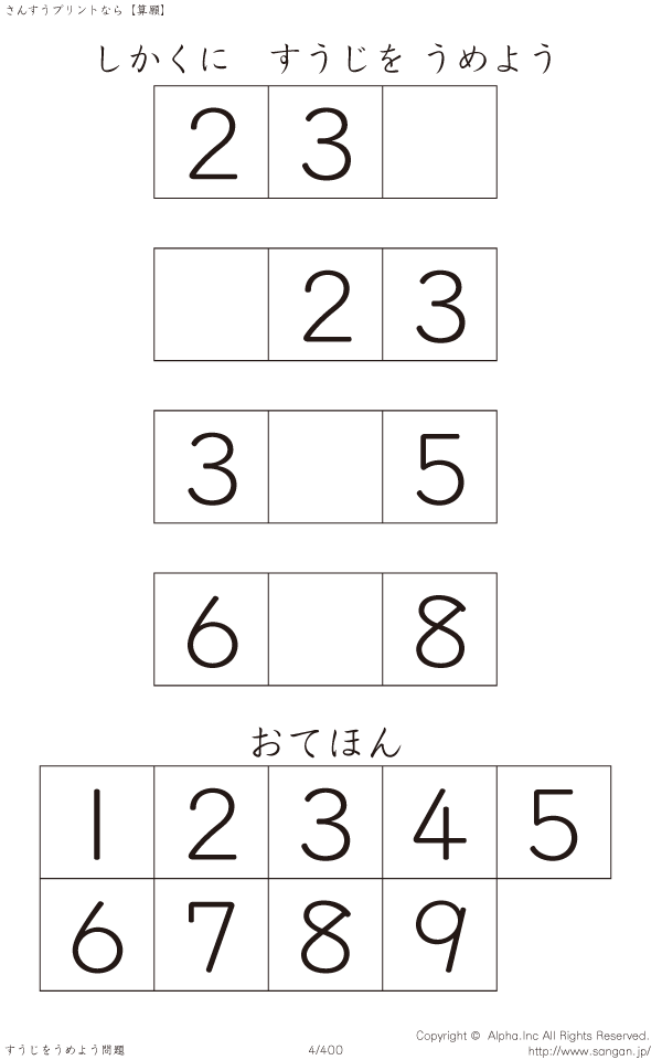 上記のボタンから「しかくにすうじをうめよう」の算数数学ドリル・計算ドリル(PDFプリント)がダウンロードできます。個人利用は無料です(家庭以外での配布は有料です)。