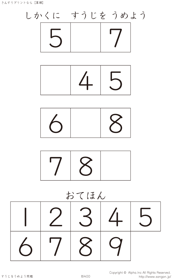 上記のボタンから「しかくにすうじをうめよう」の算数数学ドリル・計算ドリル(PDFプリント)がダウンロードできます。個人利用は無料です(家庭以外での配布は有料です)。