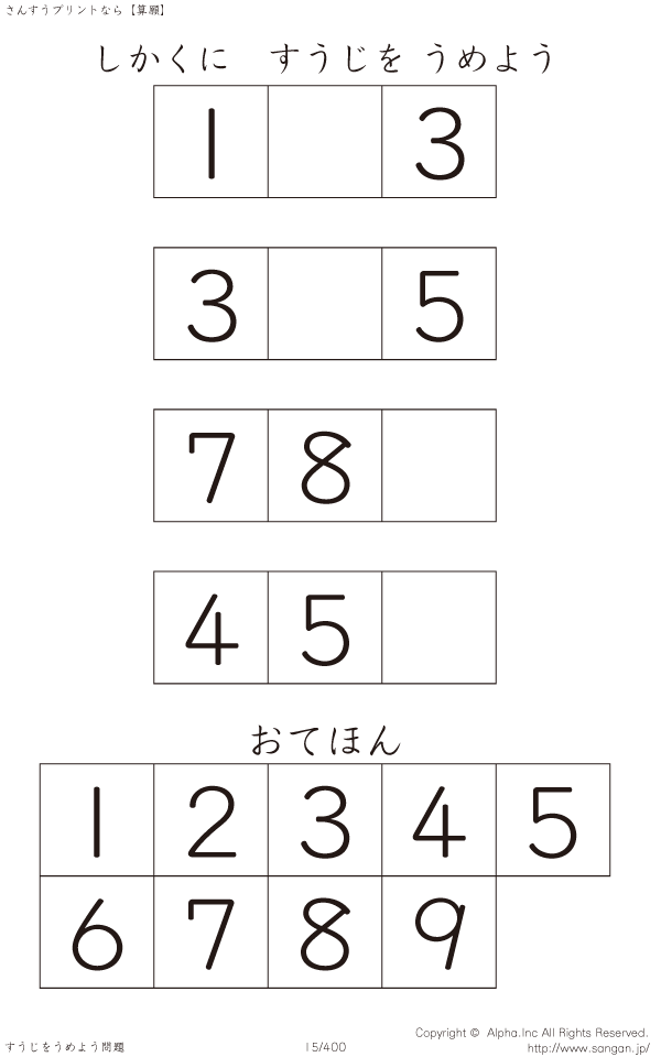 上記のボタンから「しかくにすうじをうめよう」の算数数学ドリル・計算ドリル(PDFプリント)がダウンロードできます。個人利用は無料です(家庭以外での配布は有料です)。