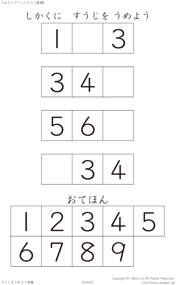 上記のボタンから「しかくにすうじをうめよう」の算数数学ドリル・計算ドリル(PDFプリント)がダウンロードできます。個人利用は無料です(家庭以外での配布は有料です)。
